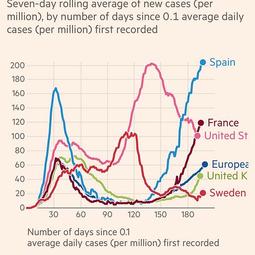In fact, many of the patterns that we saw in late June in the southern border (sunbelt) states seem to be replicating themselves here in France and Spain. We’re seeing a surge in cases that is not yet manifesting in a surge in deaths.